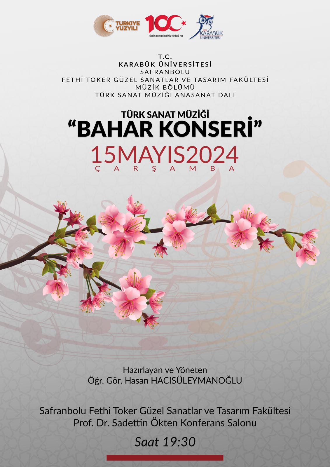 Safranbolu Fethi Toker Güzel Sanatlar ve Tasarım Fakültesi Müzik Bölümü tarafından 15 Mayıs 2024 Çarşamba günü saat: 19.30 da Safranbolu Fethi Toker Güzel Sanatlar ve Tasarım Fakültesi Prof. Dr. Sadettin Ökten Konferans salonunda "Türk Sanat Müziği Bahar Konseri" düzenlenecektir. Konserimiz tüm personel, öğrenci ve halkımızın katılımına açıktır.